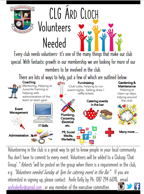 If anyone has any questions about volunteering, please contact Aoife Kelly on Ph 087 294 6698, by email aoifeakelly@gmail.com, or any member of the executive committee