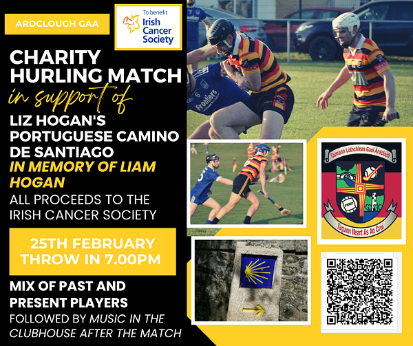Ardclough GAA are delighted to host a Charity Hurling Match on Saturday, February 25th in support of Liz Hogan's charity walk of the “Portuguese Camino de Santiago” in memory of one of our club’s most respected figures Liam Hogan.